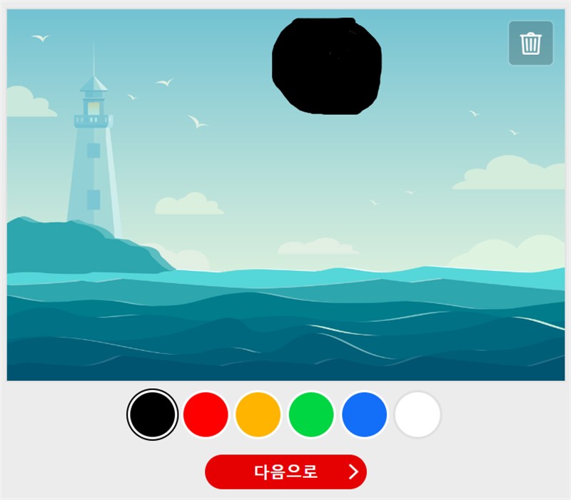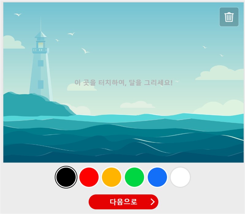 그럼 다음 화면에서 등대 모습이 보이고, 갈매기도 보이면서 넓은 바다의 모습이 보인다. 화면 중앙에 질문이 보인다. 이 곳을 터치하여, 달을 그리세요! 라고 보인다.