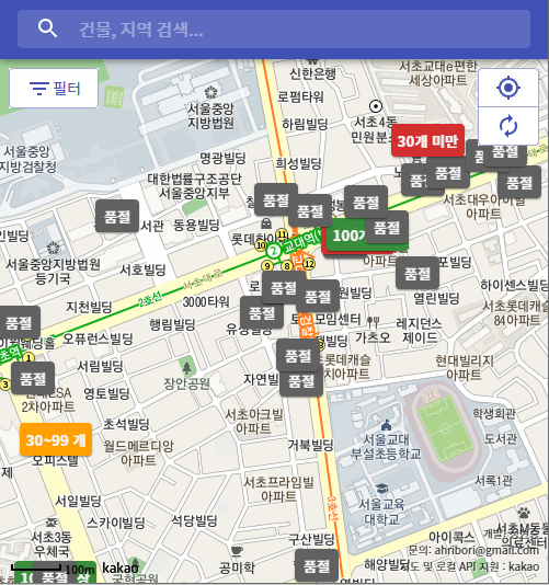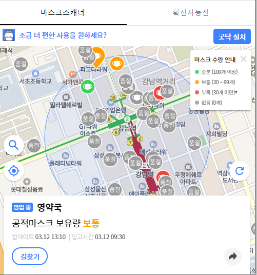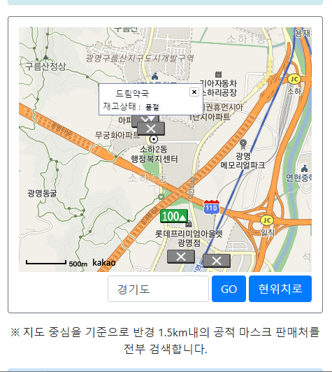 지도를 확대하거나 이동해서 서비스 이용이 가능하다. 마스크가 품절된 곳이나 몇개의 재고량이 존재하는지를 실시간으로 카카오 지도에서 바로 확인 가능하다.