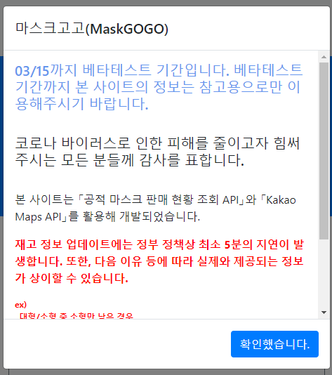 마스크고고 사이트에서는 앱 어플 설치 없이도 서비스 이용이 가능하다. 처음 사이트에 접속하게 되면 안내문이 나타나게 된다. 재고 정보 업데이트에는 정부 정책상 최소 5분정도의 지연이 발생할 수 있다.