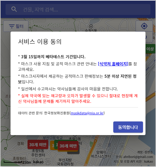 마스크사자사이트를 이용하려면 링크 연결된 페이지에 접속을 하면 된다. 첫 화면에서 서비스 이용 동의에 대한 내용을 참고하기 바란다.