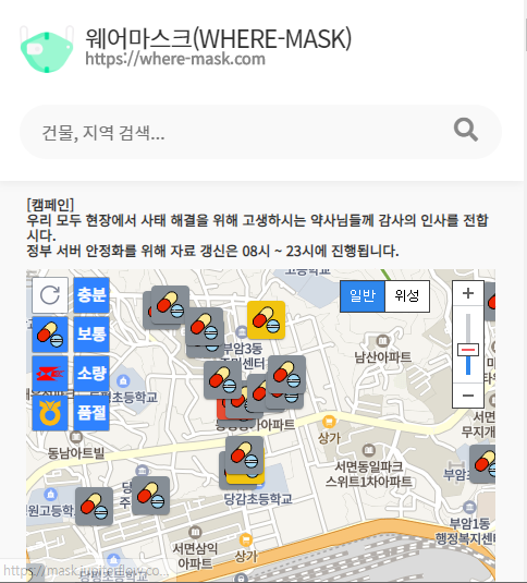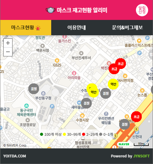 마스크요있다에서는 마스크 수량을 명확하게 표시되어 있지는 않고, 품절, 조금, 약간, 많음 등으로 표시된다.