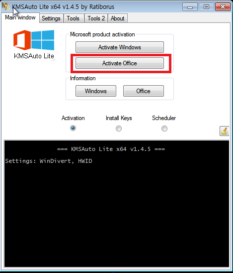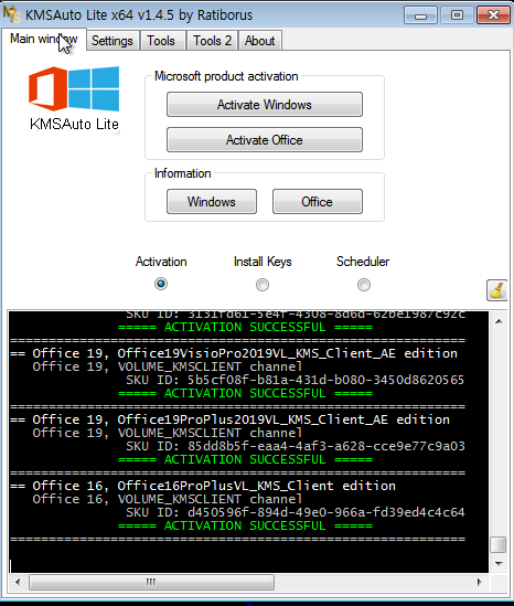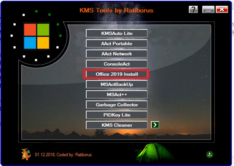 KMS Tools by Ratiborus 창이 나타난다. 개발자가 Ratiborus라는 사람이 개발한 정품인증 코드 툴이다. Office 2019 Install 을 클릭한다.