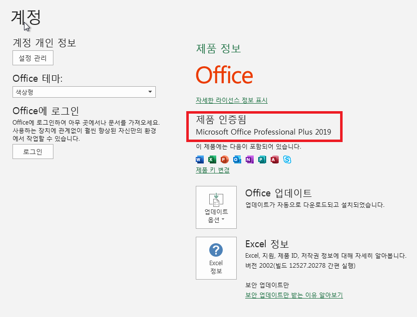 엑셀2019, 파워포인트2019, 워드2019 등 패키지 프로그램을 실행하게 되면 화면과 같이 한글패치 버전이 적용된 상태에서 제품 인증됨으로 표시되면 정상적으로 설치가 완료된 것이다.