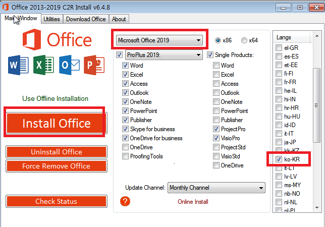 사진과 같이 Microsoft Office 2019을 선택하고, Langs(언어)는 ko-KR를 꼭 선택한다. 그리고 설치할 패키지를 선택하도록 하자. 워드, 엑셀, 엑세스, 아웃룩, 원노트, 파워포인트, 스카이프, 원드라이브 등이 있다.