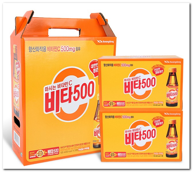 비타500의 경우 이미, 이취가 없고 고유의 향미가 있는 노란색의 분말이나 음료로 된 것이다. 1일 1회만 섭취할 것을 권장하고 있으며, 여러가지 기능들이 존재한다. 특히 결합조직 형성과 기능유지에 필요하며, 철의 흡수에 필요하도록 도와준다. 유해산소로부터 세포를 보호하는데 필요하다. 탄수화물과 에너지 대사에 필요하며, 체내 에너지 생성에 필요하다.