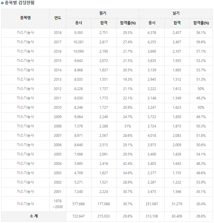 합격률은 대체로 낮은 편이다. 굉장히 어렵다는 이야기. 최근 2018년도에 가스기능사 필기시험 합격자율을 보게되면, 30%를 넘지 못했다. 최근 10년동안 합격률이 30%내에 있다.