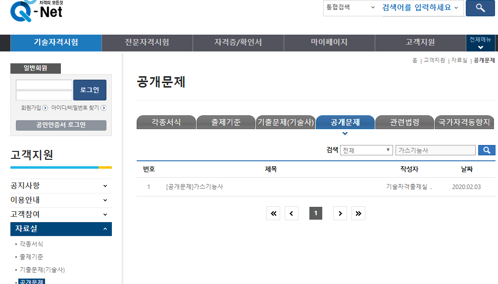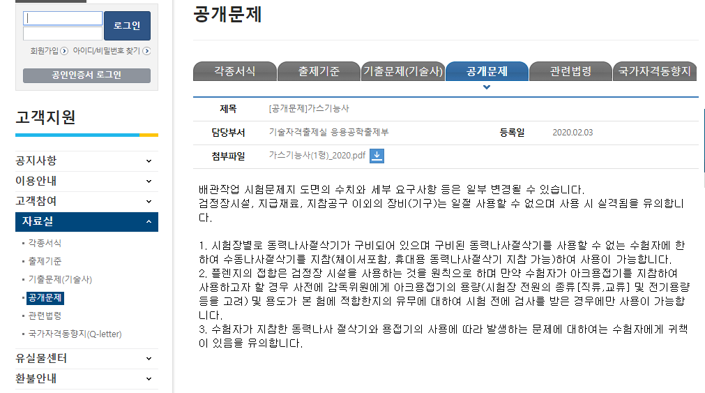 고객지원 -> 공개문제 -> 가스기능사 순서대로 검색한다. 검색결과가 1개만 노출되는데, 선택한다.