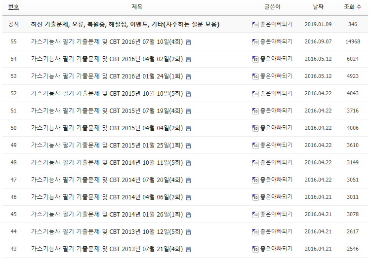 가스기능사 자격증 기출문제는 현재 2016년 7월10일자까지만 공개된 상태다. 공개된 자료가 상당히 많기 때문에 매회차별로 문제를 풀어보면 된다.