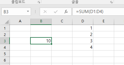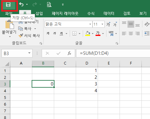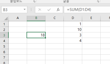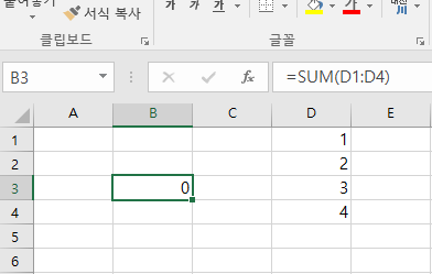 엑셀표를 알겠지만 이미 =sum(D1:D4) 까지 숫자가 입력되어 있지만, 수식 자동계산이 전혀 안되고 있는 상황이다. 처음에 필자는 이와 같은 증상이 생기길래 정말 신기했고, 엑셀자체에 문제가 있는지, 아니면 바이러스가 걸렸는지 의심하게 되었다.