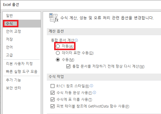 사실 통합 문서 계산은 기본적으로 자동으로 옵션설정이 되어 있다. 누군가 변경하지 않는 이상 변경될 이유가 없다.