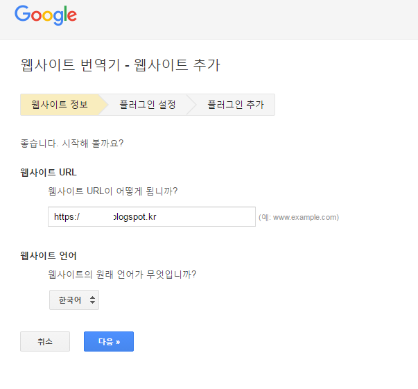 차례대로 웹사이트 URL -> 웹사이트 언어 순대로 입력을 하고 다음을 선택하자.