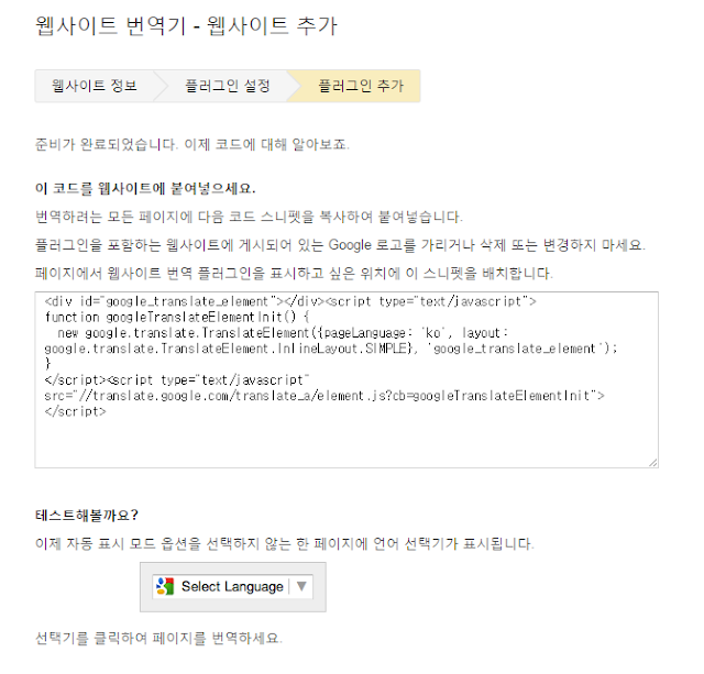 이로써 자신의 블로그에 구글번역기 설치가 완료되었다.