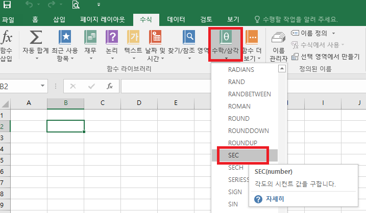 엑셀 SEC 함수를 실행하려면 엑셀 -> 수식 -> 수학/삼각 -> SEC 함수를 선택하면 된다. 함수 인수에서 Number값에 각도의 시컨트 값을 구하기 위해서 정수를 입력해준다.