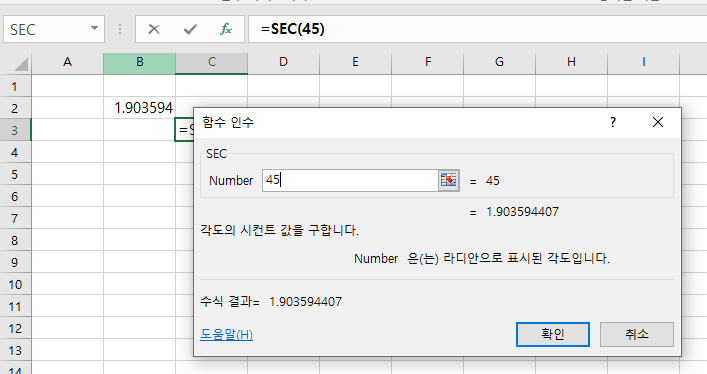 =SEC(45) 수식의 경우 45도 각도의 시컨트 값을 반환되게 된다. 결과값은 1.90359으로 출력된다.