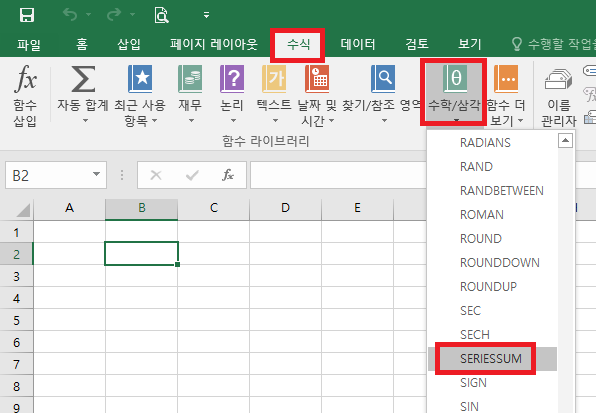 수식을 정확하게 사용하려면 우선 엑셀 프로그램을 실행시킨다. 수식 -> 수학/삼각 함수를 선택하고 나서 SERIESSUM 선택하도록 하자.