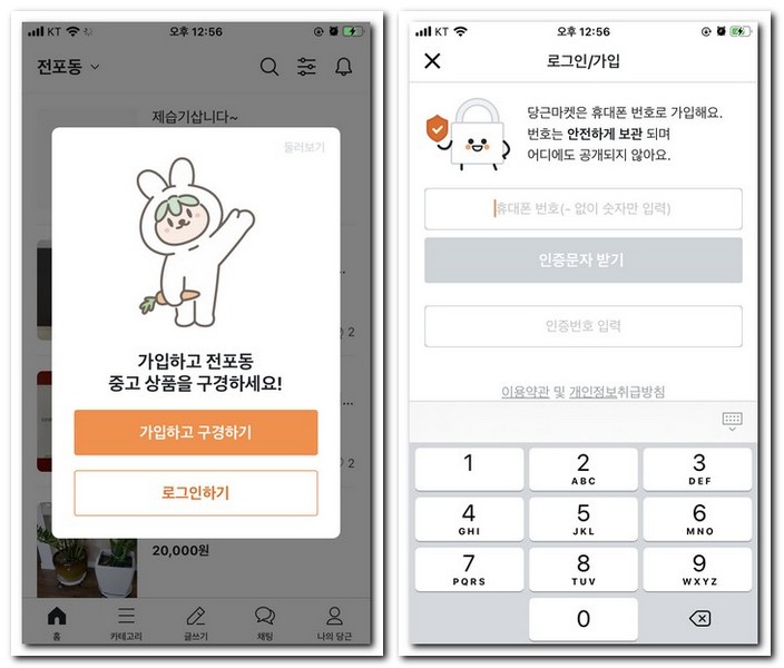 가입하는 방법은 어렵지 않다. 휴대폰(핸드폰) 인증문자를 받고, 입력하면 끝이다. 단순하게 중고 물품을 검색하는것은 회원가입 없이 가능하지만 중고물품을 직접 올리고, 거래까지 진행하기 위해서는 회원가입은 필수이기 때문이다.