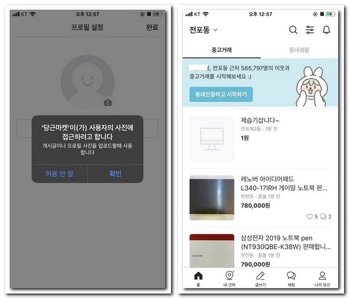 회원가입 진행과정 중에서 프로필 설정란이 확인할 수 있다. 당근마켓에서는 사용자의 사진에 접근하려고 하는데, 프로필 사진 등록을 원치 않는다면, 허용 안함을 선택하면 된다.