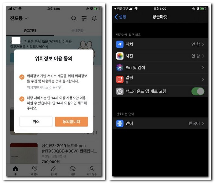 우선 중고거래를 정상적으로 하려면 위치정보 이용 동의가 필요하다. 위치정보 기반 서비스 제공을 위해서 위치정보를 수집 하거나 이용하는것에 동의해야되며, 만 14세 이상의 사용자만 이용할 수 있기 때문에 체크하고 진행하도록 하자.