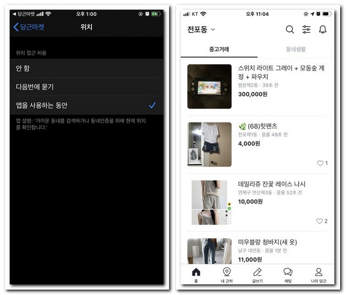 일반적으로 위치접근 허용이 안 함으로 되어 있는데, 당근마켓 앱을 사용하는 동안에는 자신의 위치를 정확하게 파악하기 위해서 설정해두는것이 좋다.