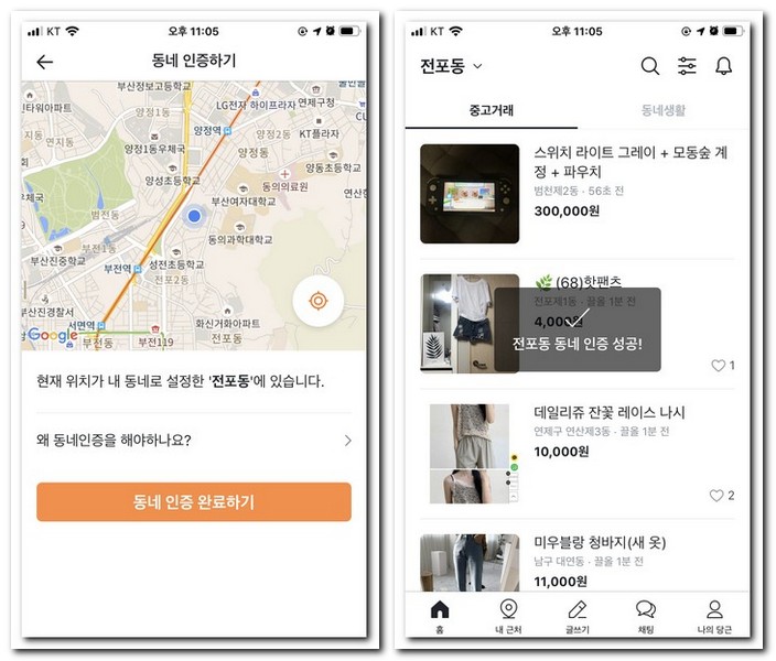 동네 인증이 완료되면 동네 인증 성공 메시지가 표시된다. 이후부터 글쓰기를 통해 안전하게 중고물품을 업로드 할 수 있고, 신뢰할 수 있는 판매자가 되는것이다.