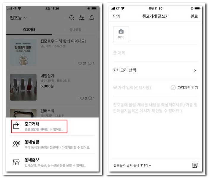 우선 중고물품을 업로드 하기 위해서는 글쓰기 -> 중고거래를 터치하도록 한다.