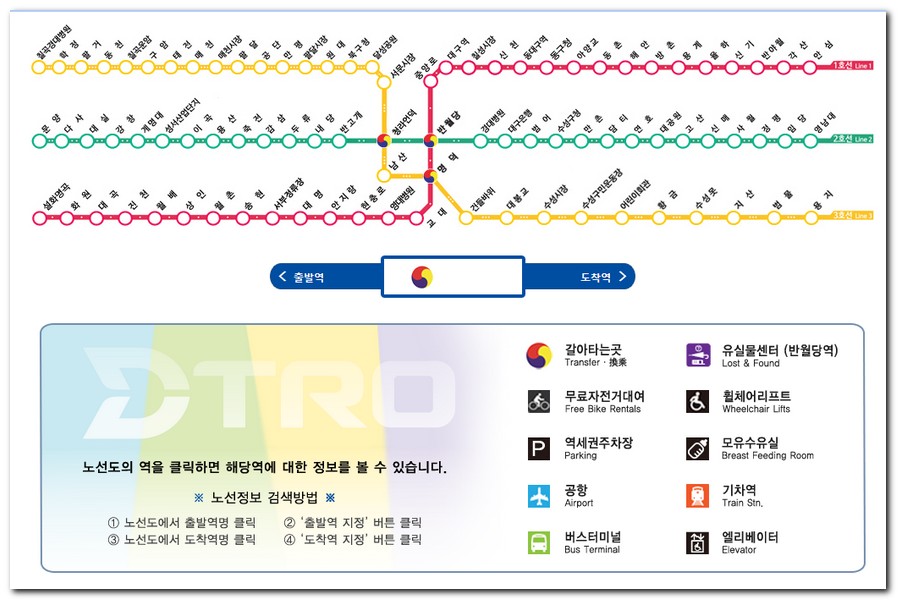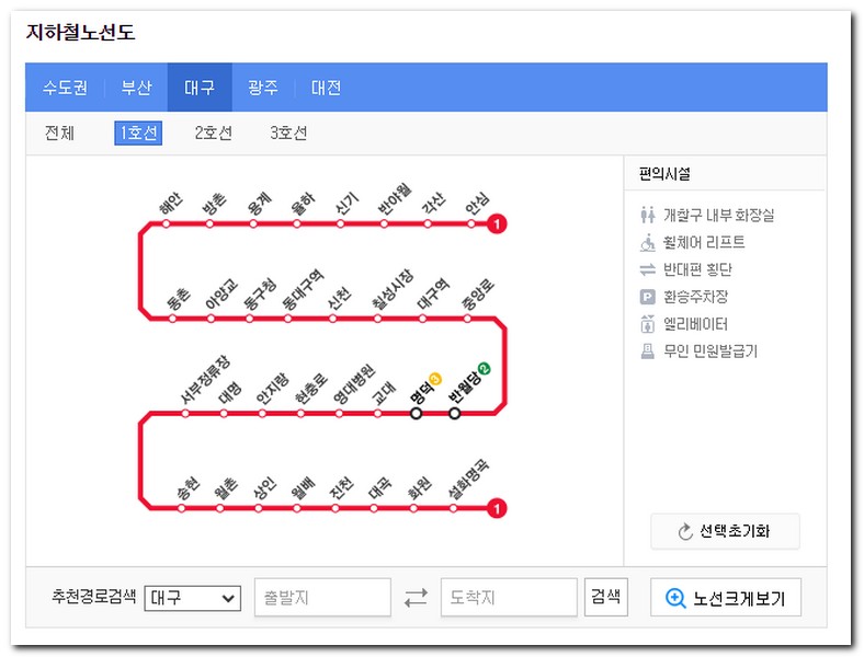 대구 지하철은 1호선 2호선 3호선 까지 있다. 4호선은 아직 존재하지 않는다. 대구도시철도공사 홈페이지에서 전체 지하철 노선도를 확인해본다. 노선도의 역을 클릭하게 되면 해당역에 대한 정보를 볼 수 있다. 노선도에서 출발역명 클릭을 하고 출발역 지정 버튼을 클릭한다. 다음은 노선도에서 도착역명 클릭해서 도착역 지정 버튼을 클릭하면 된다.