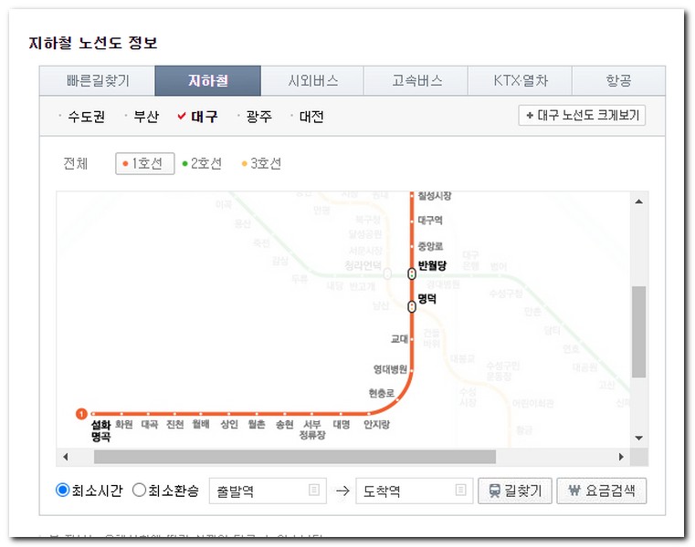 네이버에서는 대구 노선도 크게 보기를 통해서 조금 더 자세히 확인할 수 있으며, 최소시간 최소환승 되는 구간을 조회해서 길찾기도 할 수 있다.