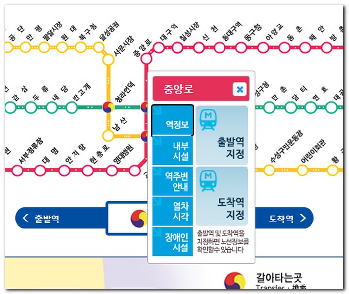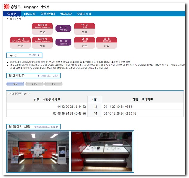 필자가 중앙로 역을 선택해서 역정보와 내부시설 역주변 안내 열차시각등 각종 정보에 대해서 한 번 확인해본다.