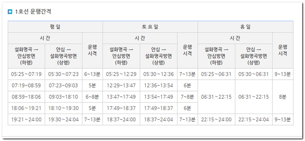 1호선 열차 운행간격은 평일 설화명곡역 안심방면 하행선과 안심 설화명곡방면 상행선 토요일, 휴일 까지 모두 확인된다.
