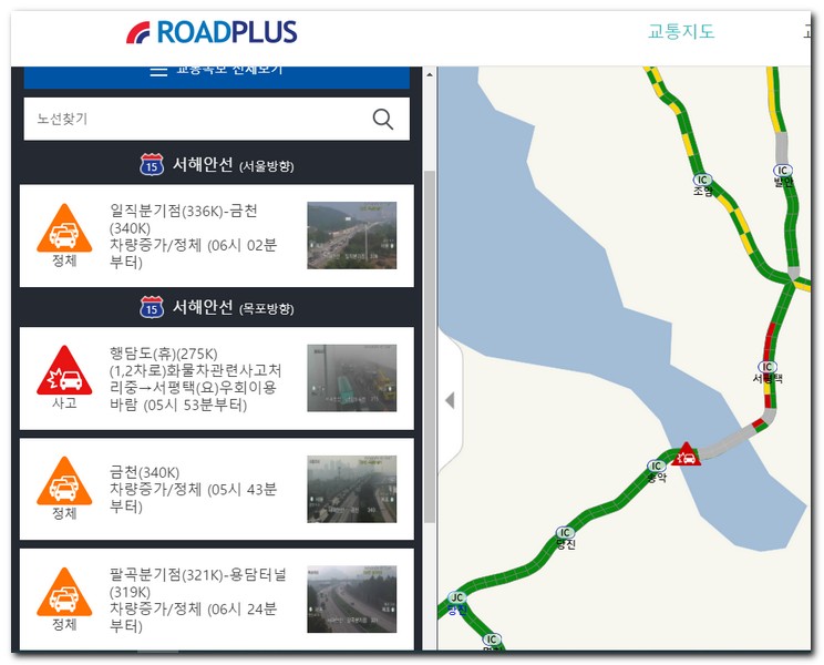 서해안고속도로의 교통상황에 대해서 분석이 필요한 시점인데, 우선 교통상황 CCTV를 통해서 어느쪽이 안전하고, 어느쪽이 불안한 지역인지를 판단할 필요성이 있다. 우선 서울지점부근과 서해대교 교통상황도 함께 자세히 보도록 하자.