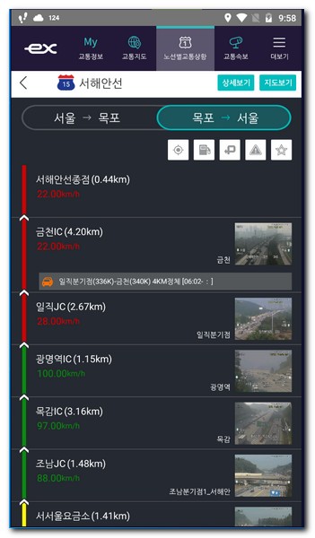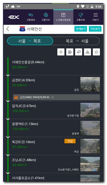 서울에 도착하면서부터 정체가 심해진다는걸 확인할 수 있을만큼 얼마나 이곳이 상습정체구간인지 알 수 있다. 지도를 통해서 서해안선의 고속도로 교통정보를 세부적으로 확인해보면 광명역 근처 서울 부근 휴게소에서는 작업중에 있다.