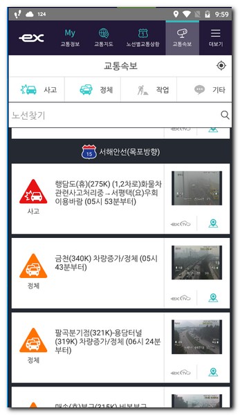 이번에는 로드플러스 어플(앱)인, ex 한국교통공사 앱의 교통속보 메뉴를 보자. 교통속보 카테고리에서는 사고 정체 작업 기타 여러가지 고속도로 문제점을 확인할 수 있다.
