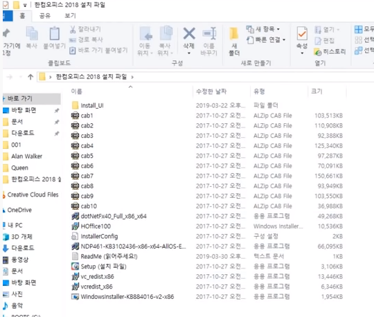 압축해제 하게 되면 한컴오피스 2018 설치 파일이라는 디렉토리가 생성 된다. 디렉토리가 들어가서 setup.exe 파일을 실행 한다.