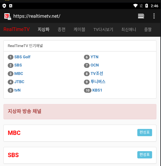 우선 리얼타임tv라는 사이트에 접속해서 지상파 방송채널을 확인하고 시청하면 된다. realtimetv 인기채널에는 sbs golf, ytn, sbs, ocn, mbc, tv조선, jtbc, 투니버스, tvn, kbs1까지 리스트에 올라와 있다.