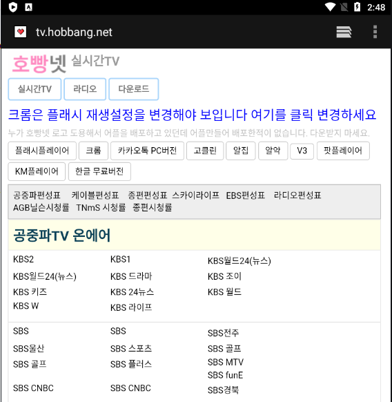 오래전부터 호빵넷tv에서는 실시간 tv시청이 가능하도록 되어 있다. 크롬은 플래시 재생설정을 변경해야만 정상적으로 영상을 볼 수 있게 된다.