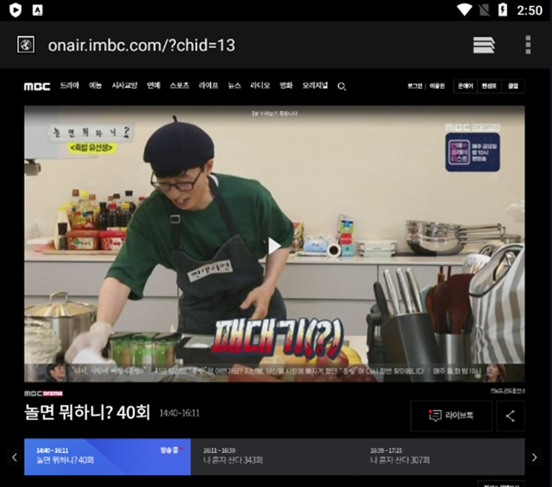각 카테고리 메뉴를 선택하면 이처럼 방송국 홈페이지로 자동 이동되면서 영상시청이 가능하다. 화질은 무료이기 때문에 낮은 저해상도 화질을 지원한다는 단점을 가지고 있다.