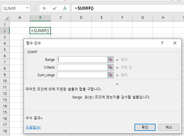 엑셀 SUMIF 함수를 실행하려면 엑셀 -> 수식 -> 수학/삼각 -> SUMIF 함수를 선택하면 된다. 함수 인수에서 SUMIF, range, criteria, sum_range 값을 입력해준다.