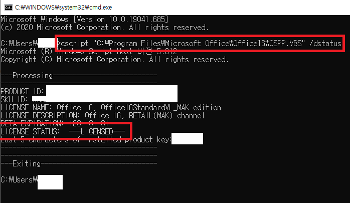 오피스 2016(32비트), 윈도우(32비트)인 경우cscript "C:\Program Files\Microsoft Office\Office16\OSPP.VBS" /dstatus