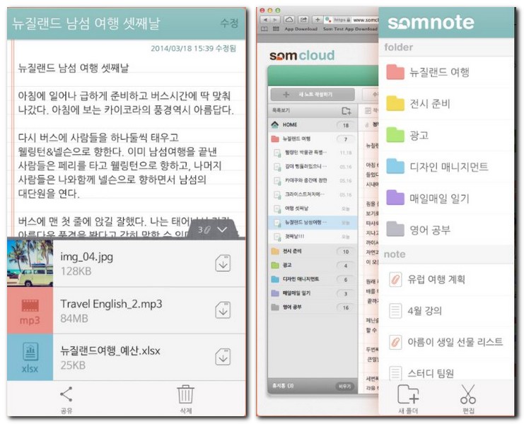 휴대폰으로 작성된 문서가 태블렛PC, 일반PC에서도 함께 동기화 되기 때문에 그때그때 떠오른 아이디어를 바로바로 메모할 수 있는게 장점이다. 일반적인 메모기능과 사진, 각종 문서 파일 등을 사용할 수 있으며 간단하게 그려서 노트에 첨부하는 스케치북 기능이 제공된다.