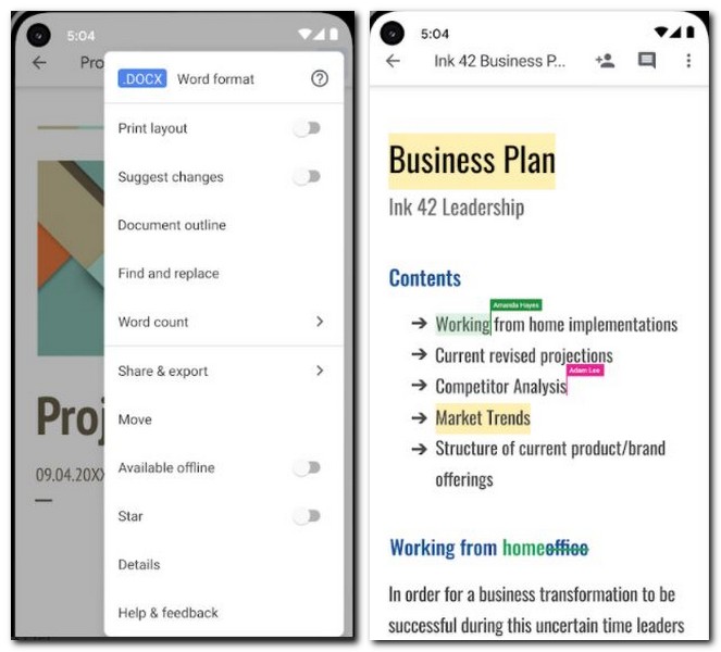 안드로이드 휴대폰이나 태블릿pc에서 구글 문서 앱을 사용해서 문서를 작성하거나 수정하고 다른 사용자들과 함께 공동작업을 진행할 수 있는 공유기능도 함께 제공 된다.