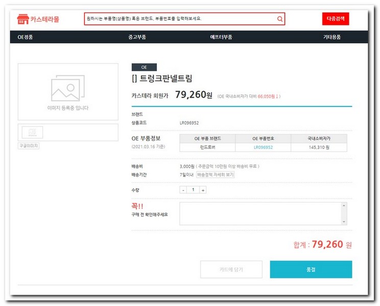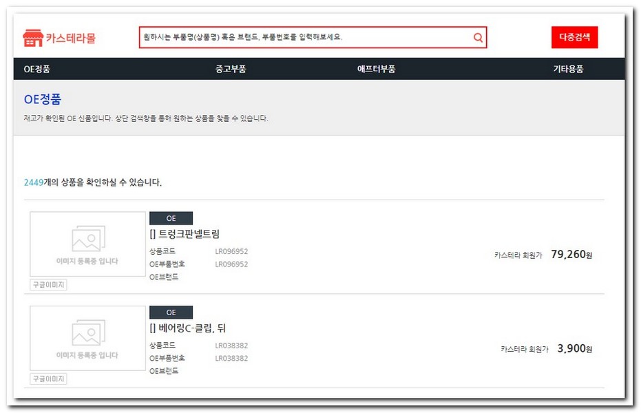 카스테라몰에서는 원하는 부품명을 검색하게 되면 중고부품부터 애프터부품, OE부품까지 모두 검색을 할 수 있다. 실제로 보유한 실물 재고만 보여주기 때문에 믿을 수 있긴 하지만 상세상품명에서 사진이 보이지 않는 단점이 존재하기 때문에 아쉬움으로 남는다.