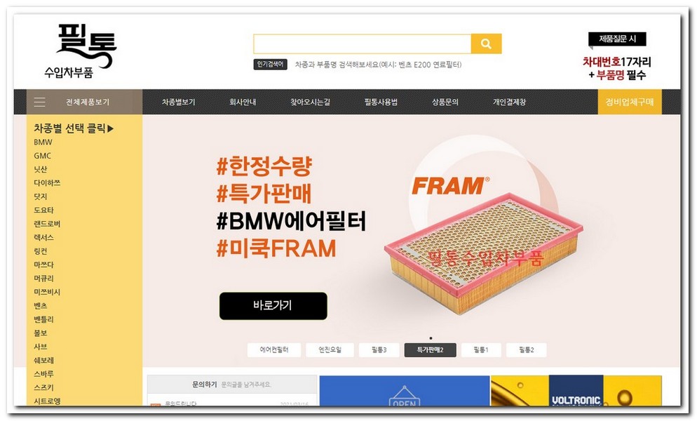 필통에서는 수입차 부품을 바로 직구해서 구입할 수 있는 사이트다. 필통사이트에서 정상적으로 이용하려면 차대번호 확인이 필수 이며 인터넷 댓글을 통해서 확인할 수 는 없다고 한다. 카카오톡이나 문자를 통해서 주문시 차대번호 확인과 부품명을 정확하게 기재해야된다고 된다.