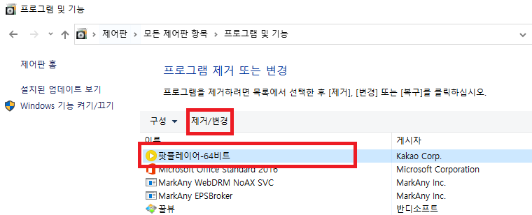 팟플레이어-64비트 확인(32비트 윈도우 운영체제라면 32비트라고 표시된다). 제거/변경 클릭