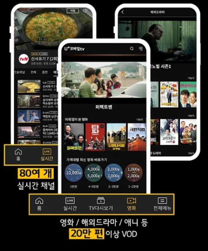 TV무료 실시간 시청이 가능하도록 스마트폰 앱에 유플러스 모바일 앱을 다운로드 받고 설치하면 된다. 80여개의 실시간 채널 및 TV다시보기 기능이 함께 제공되고 있고, 영화 미드 애니메이션 다큐 등 20만편 이상의 국내 최대 VOD를 제공해주는 비디오 서비스들이다.