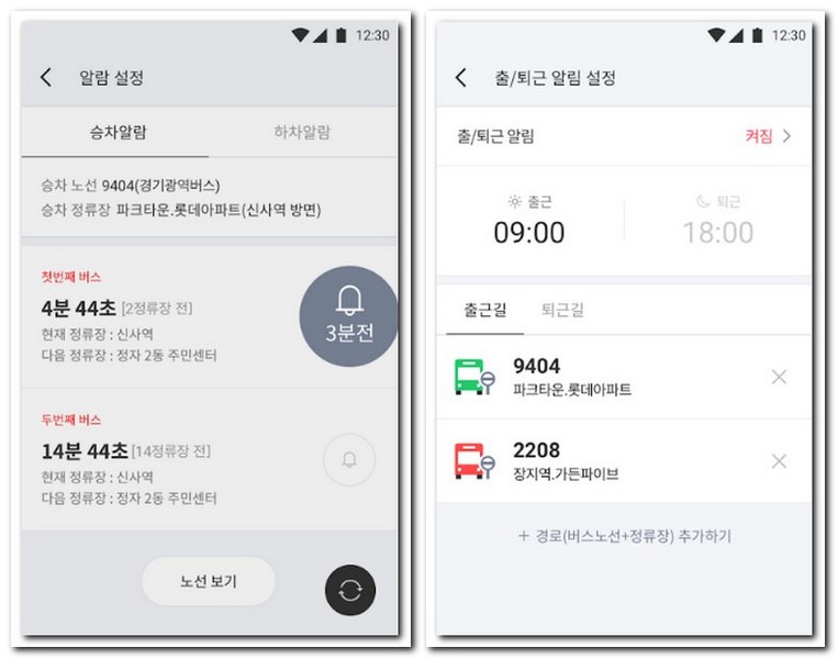 시간(1분, 3분, 5분, 10분 전)은 물론 첫번째 버스, 두번째 버스 원하는 버스로 설정 할 수 있음