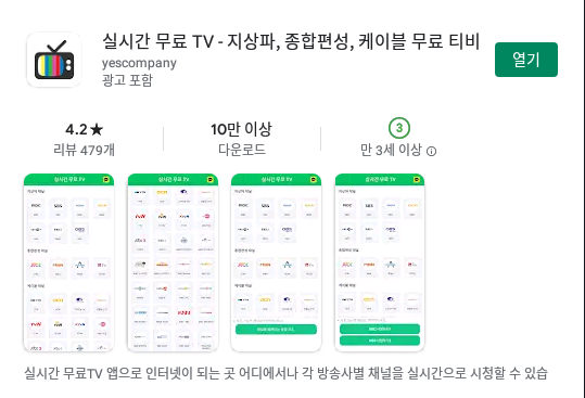 안드로이드 스마트폰 사용자라면 구글 플레이스토어에 접속 한다. 실시간 TV무료 검색을 통해서 무료 지상파TV보기 앱을 다운로드 받아 설치할 수 있다.
