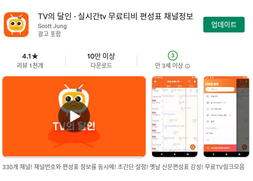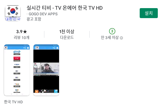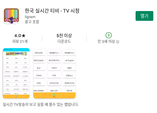 한국 실시간 티비보는 앱이다. 마찬가지로 구글플레이스토어에서 검색이 가능하고, 앱 다운로드도 가능하다. 리뷰점수는 4.0점으로 우선 무난한 점수대를 유지하고 있다.