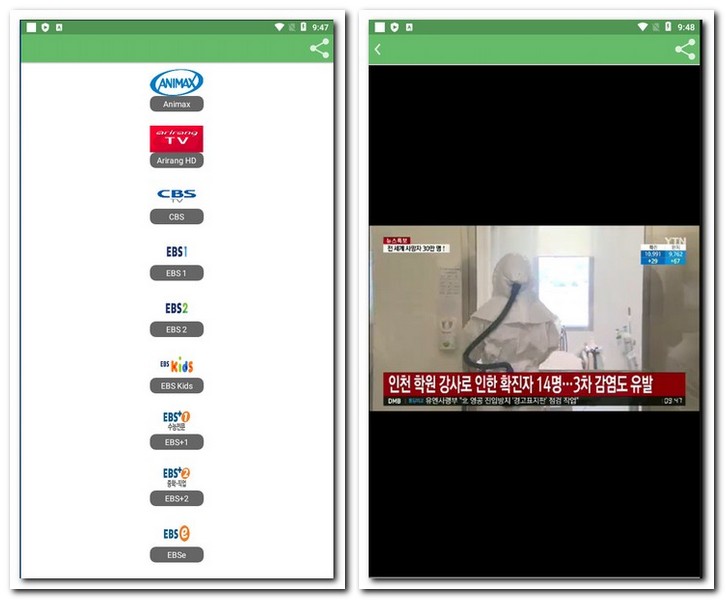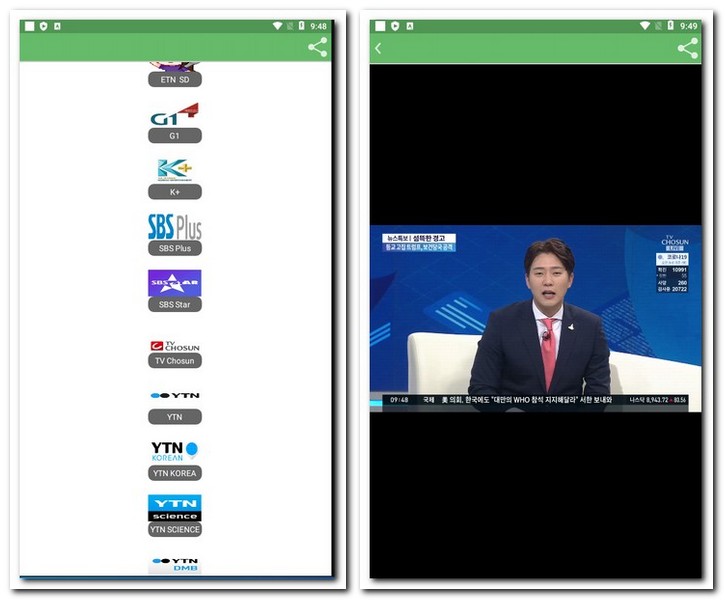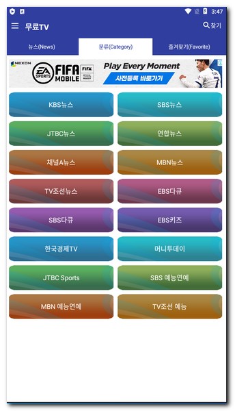 위에 설명한 실시간 지상파 TV 시청가능한 앱을 다운로드 받아 설치해서 사용해봤다. 무료TV보기 앱에서는 KBS뉴스, SBS뉴스, SBS다큐, EBS키즈, jtbc스포츠, sbs예능연예, MBN예능연예, TV조선 예능 등 뉴스와 예능 모두 시청가능했다.