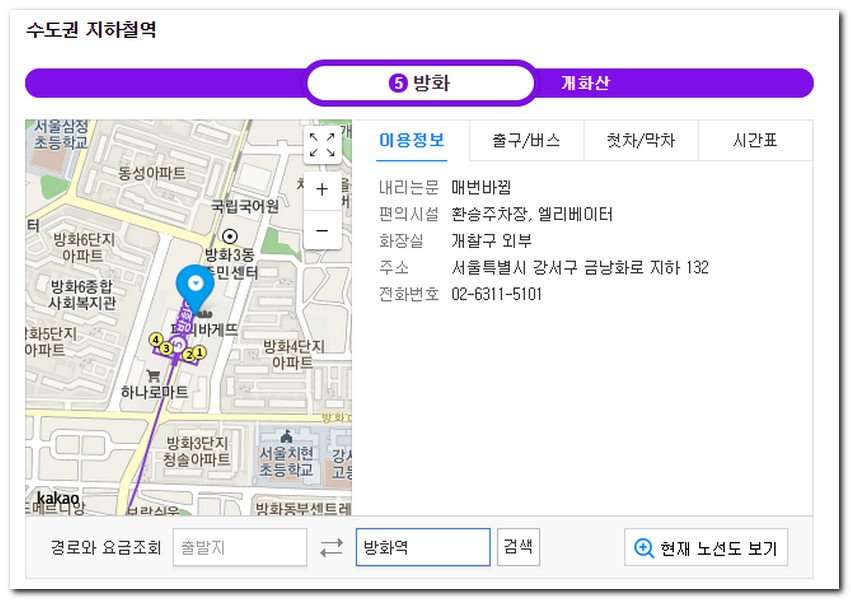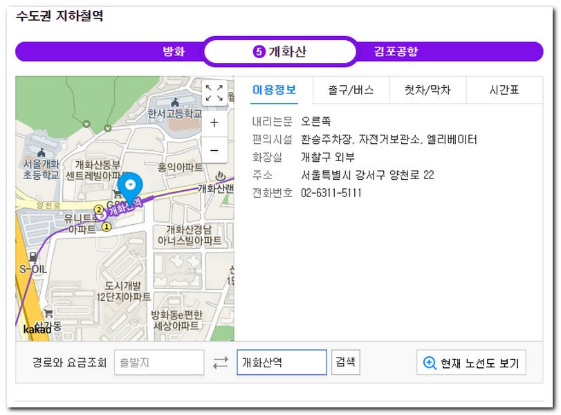 네이버 지하철 검색이나 다음 지하철 전철 검색 노선도를 참조하면 된다. 서울 지하철 5호선 노선도를 확인해본 결과 방화 개화산 김포공항 김포공항의 경우 9호선인 김포골드로 연결된다.