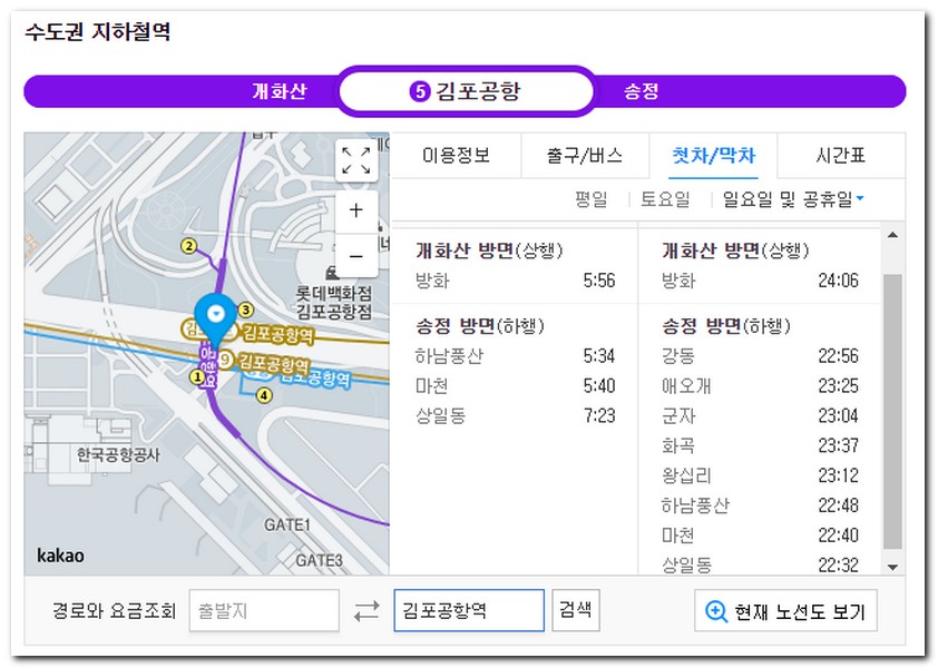 김포공항에서의 일요일 및 공휴일 첫차 막차 시간도 함께 확인할 수 있다. 개화산 방면의 상행선의 경우 방화역 5시56분 송정 방면 하행선은 하남풍산 5시 34분 된다.